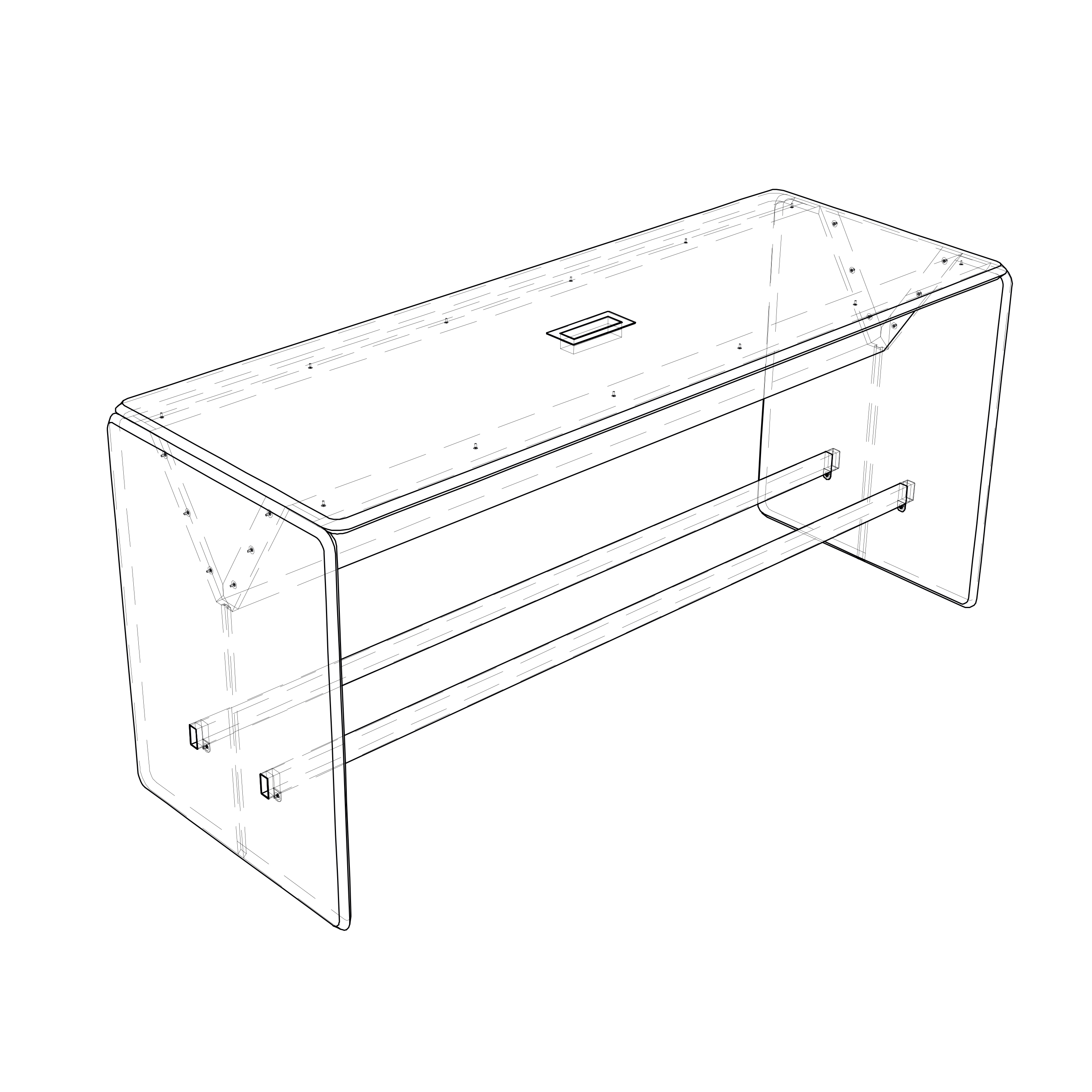 RimBar je místem setkávání v prostředí kanceláří i místem pro rychlý oběd ve firemní jídelně, vyšší sezení je pro změnu uvažování důležité. Jednoduchá konstrukce stolu je postavena na statickém prvku „tunelu, který ztužuje stolovou desku a umožňuje stabilní uchycení bočnic. Pohledová strana překližky je ofrézována na 45°, hrana stolu je tak příjemnější pro položení rukou a při sesazení s bočnicí tvoří signifikantní detail. Barevnost dostává prostor na vnitřní straně stolu a neruší.